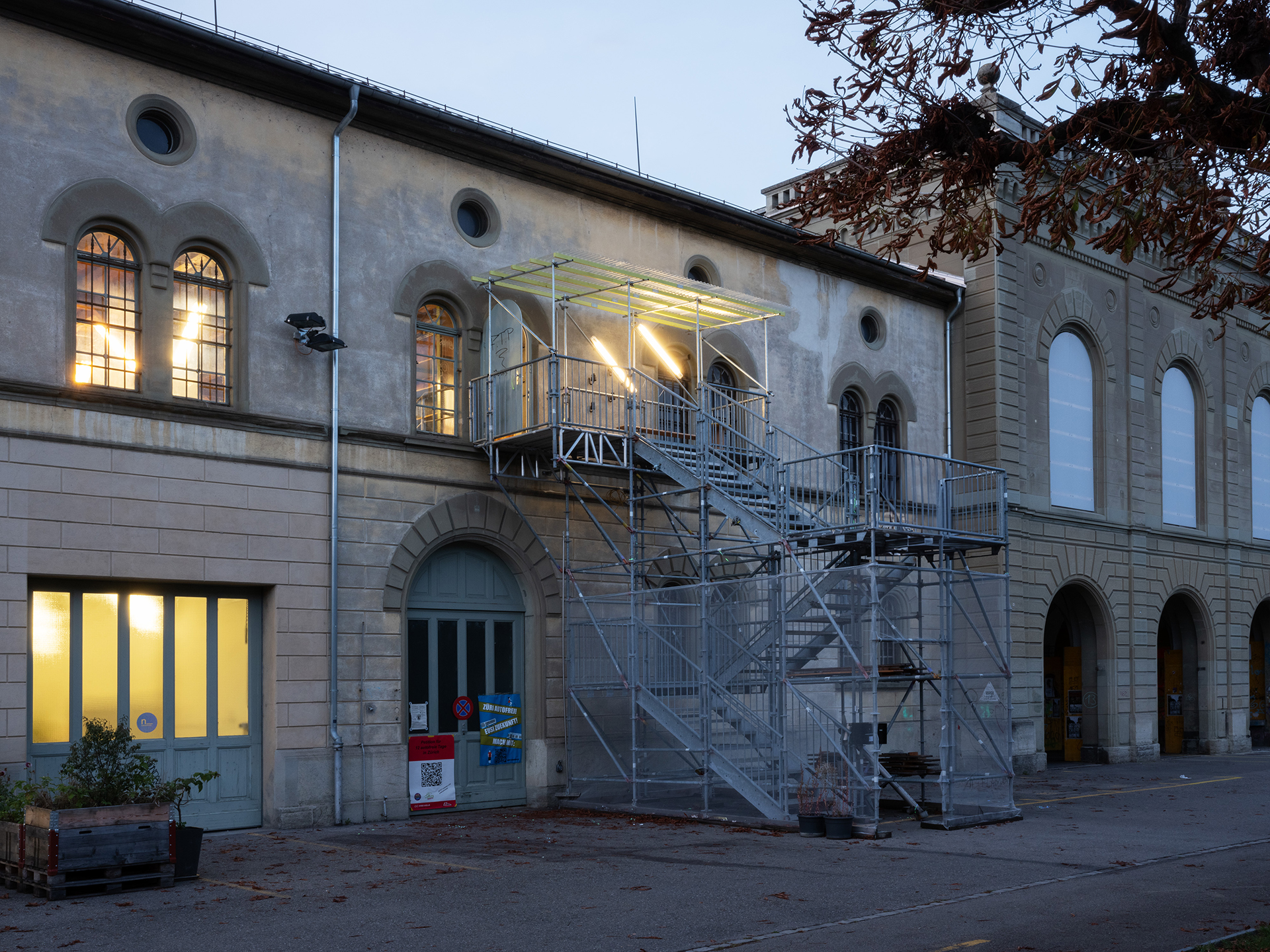 The cultural venue is designed as a temporary modular building made of wooden and shipping containers. The elements can be easily dismantled and are dimensioned for the size of lorries so that the building can easily be moved to other sites in the future. The windows and doors come from demolished buildings and thanks to reusable screw foundations there is no construction waste.